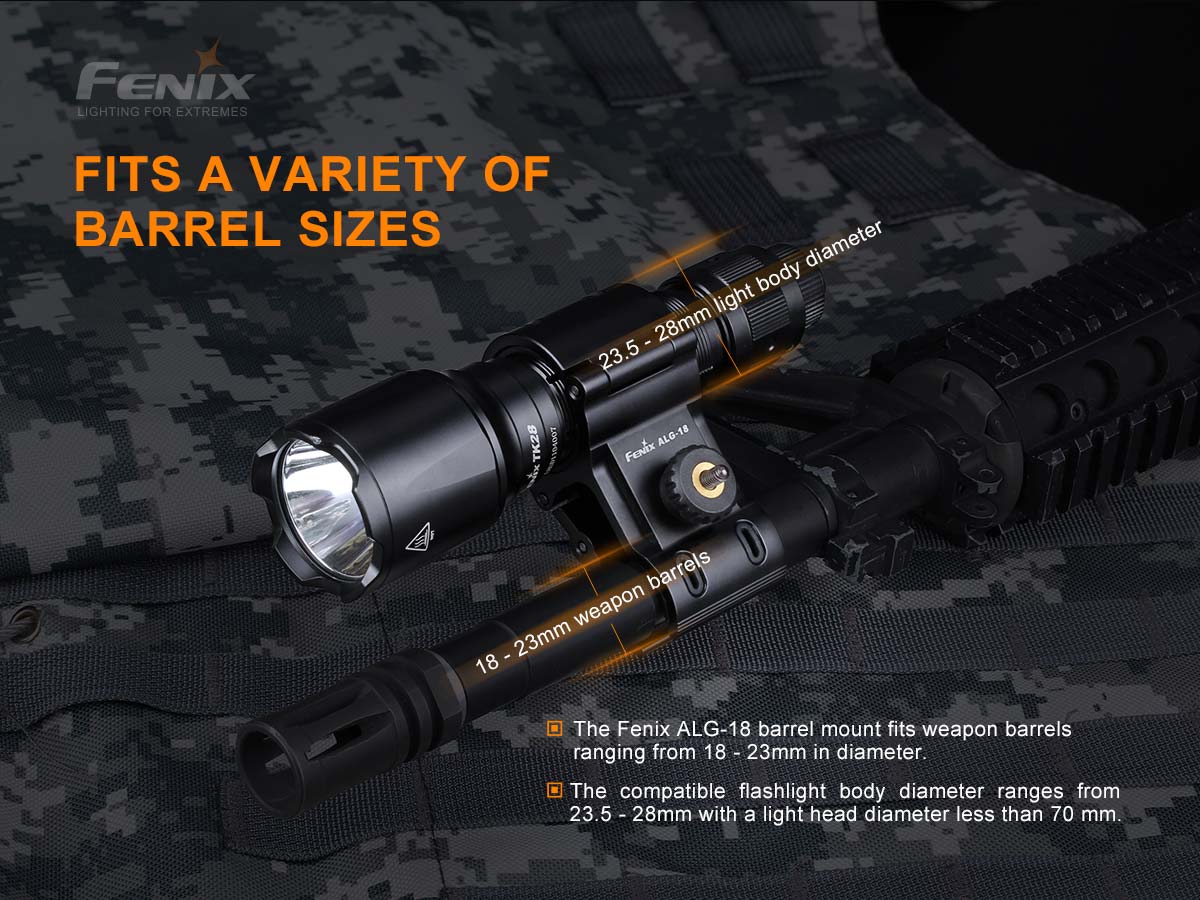 The Fenix ALG-18 Rail Mount, is a great solution for mounting a flashlight to a rifle that does not have rail attachment points. With no extra tools necessary, attach the mount to any gun barrel that is 18-23mm in diameter for a secure fit. For use with most of Fenix flashlights that have a body diameter of 23.5-28mm.